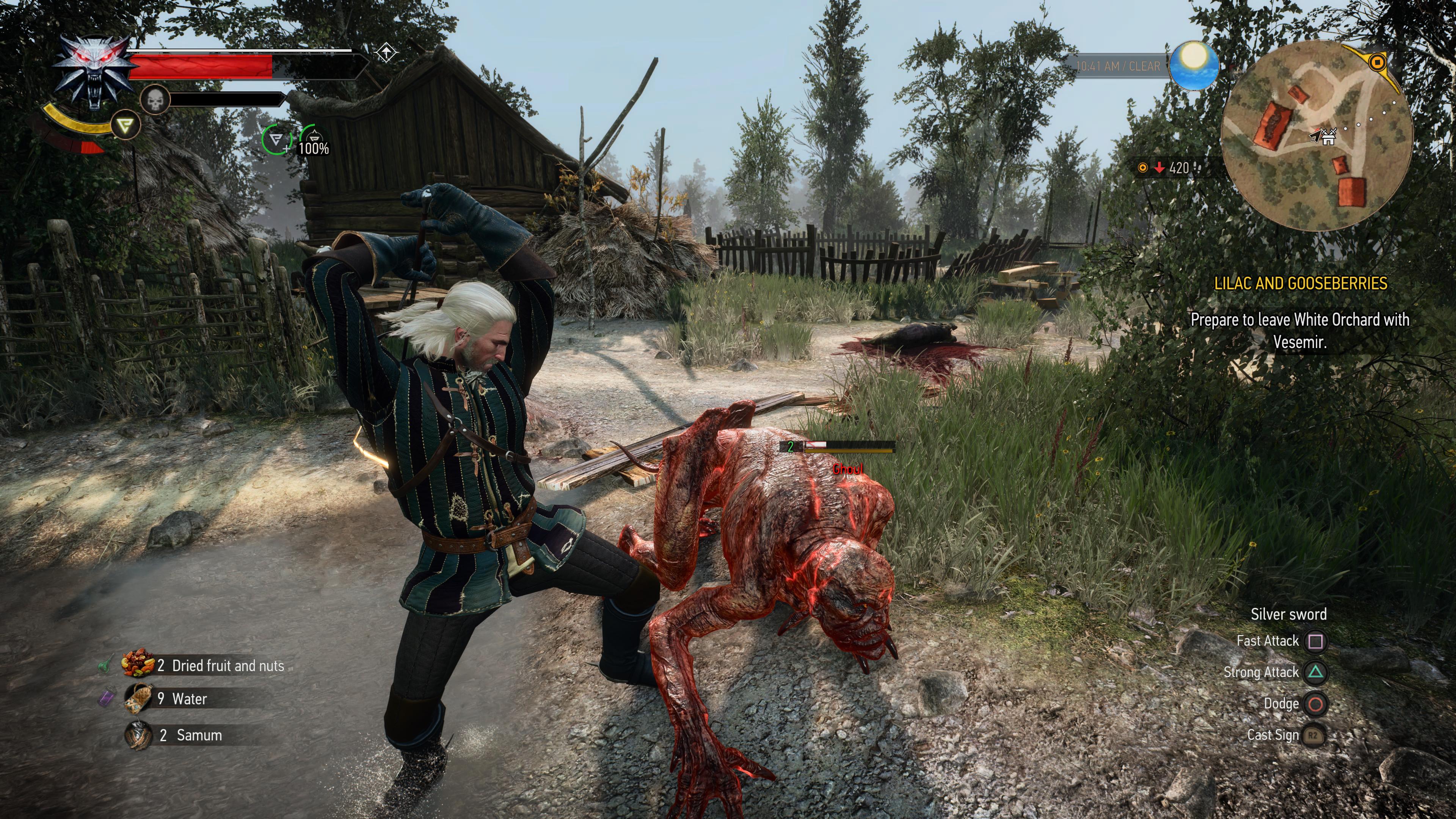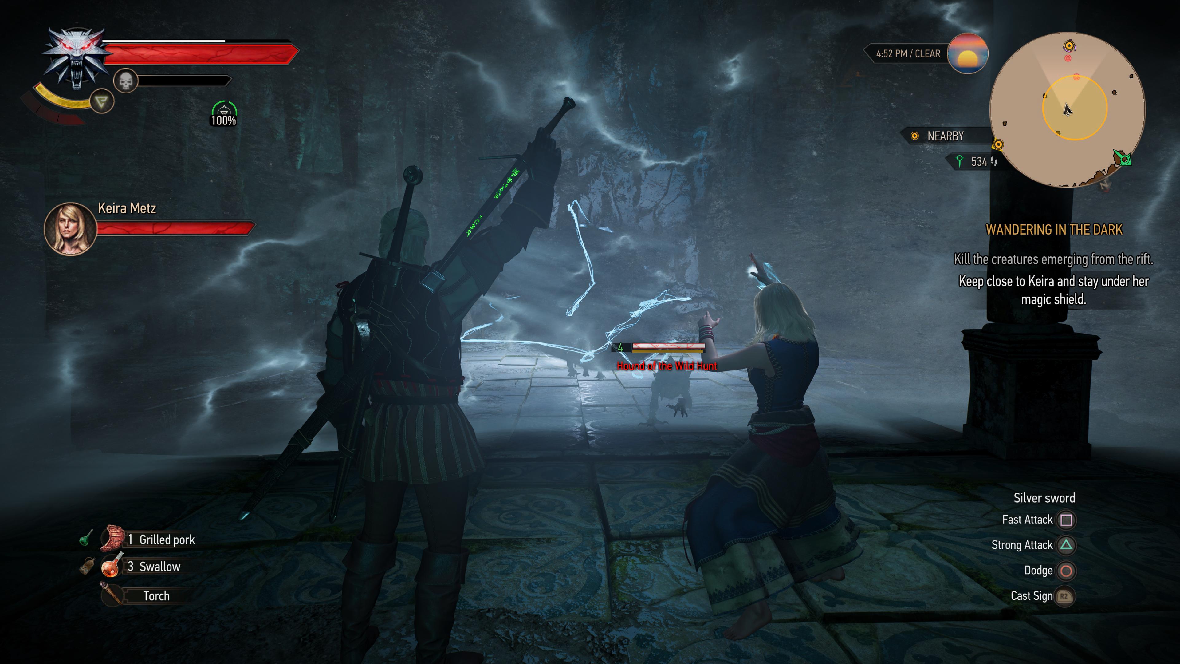 Combat is a balance of precision and strategy. Geralt wields two swords — one for humans and one for monsters — each requiring a different approach. Fast attacks allow for quick and efficient strikes against lightly armored enemies, while strong attacks deal heavy damage but are slower, making them ideal against tougher foes. Dodging and rolling play a crucial role in staying alive, as reckless aggression is often punished by powerful enemies. Dodges provide small evasive movements to avoid quick strikes, while rolling covers more distance and is useful against larger attacks. Parrying and counterattacking add another layer of complexity, as human enemies can be deflected and countered instantly, while monsters demand a more evasive approach, requiring players to read their movements carefully.