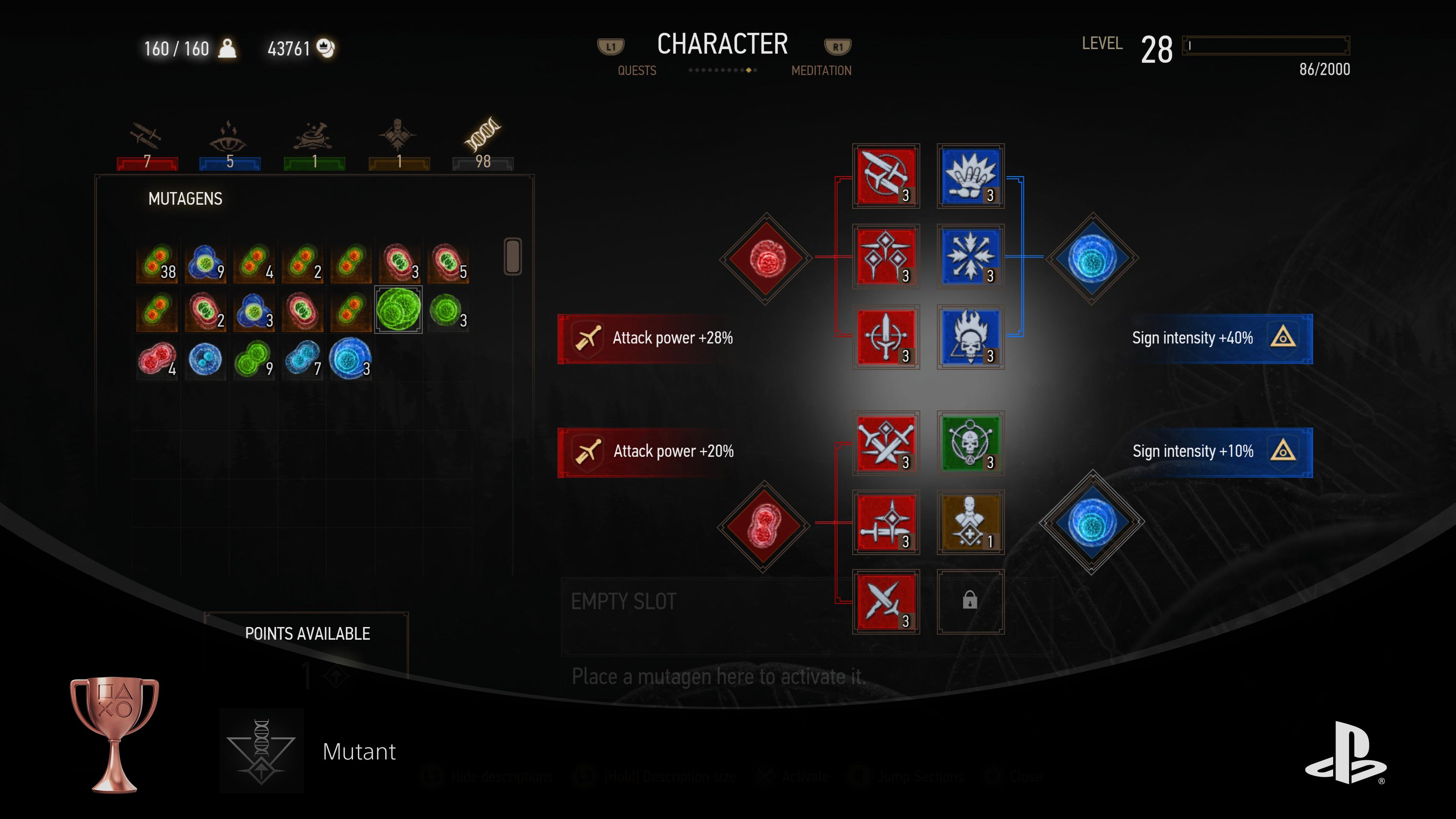 One of the most unique aspects of The Witcher 3’s progression system is the use of mutagens, special substances that grant passive bonuses. These come in three types: red for combat, blue for magic, and green for alchemy. When paired with matching abilities, mutagens provide additional stat boosts, making skill allocation an important aspect of character development. The Blood and Wine expansion further expands this system with advanced mutations, allowing for even greater customization. Some of these include Euphoria, which increases Geralt’s damage based on toxicity levels, making potion-heavy builds incredibly powerful, or Bloodbath, which significantly boosts melee damage based on enemy health. Others, like Second Life, allow Geralt to resurrect upon death once every two minutes, providing a crucial safety net in difficult encounters. These advanced mutations introduce late-game enhancements that redefine combat strategies, adding depth to an already rich progression system.
