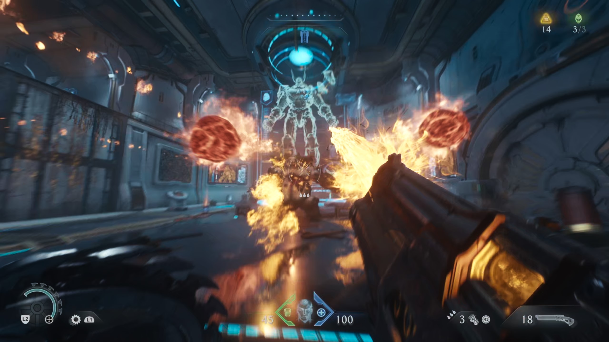 Target/frame-rate: PS5 runs at 60 fps, with id Software calling out a “buttery-smooth 60 on PlayStation” in pre-launch comms; in practice, most of the campaign holds 60 with occasional sub-60 dips during the absolute heaviest effects and enemy counts. There are no separate Quality/Performance mode toggles—it’s one tuned presentation on PS5 (and PS5 Pro).