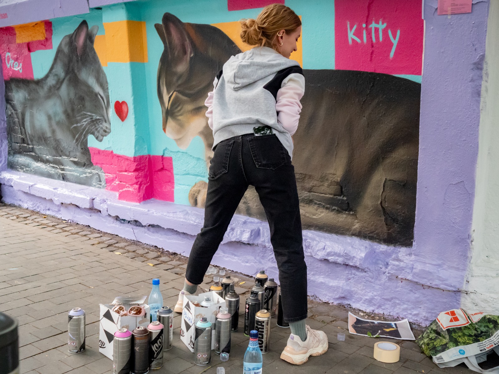 Un alt highlight sunt primele portrete mari realizate cu colega mea Andreea, la spațiul CoWorking Brezoianu. În vara 2025 am pictat la Not Available, în Cișmigiu, o serie de 6 personaje mari, retro alb-negru, de care sunt mândră, mai ales că am reușit să le fac singură în 5 zile. Sau faptul că mi-am pictat pisica – Kitty, pe Arthur Verona, la Street Delivery 2025. Participarea la Street Delivery mi se pare în sine ceva ireal și o sursă de mândrie, fiind un festival cu care am crescut, admirând artiștii care pictau, sperând și vizualizând că voi ajunge și eu acolo.